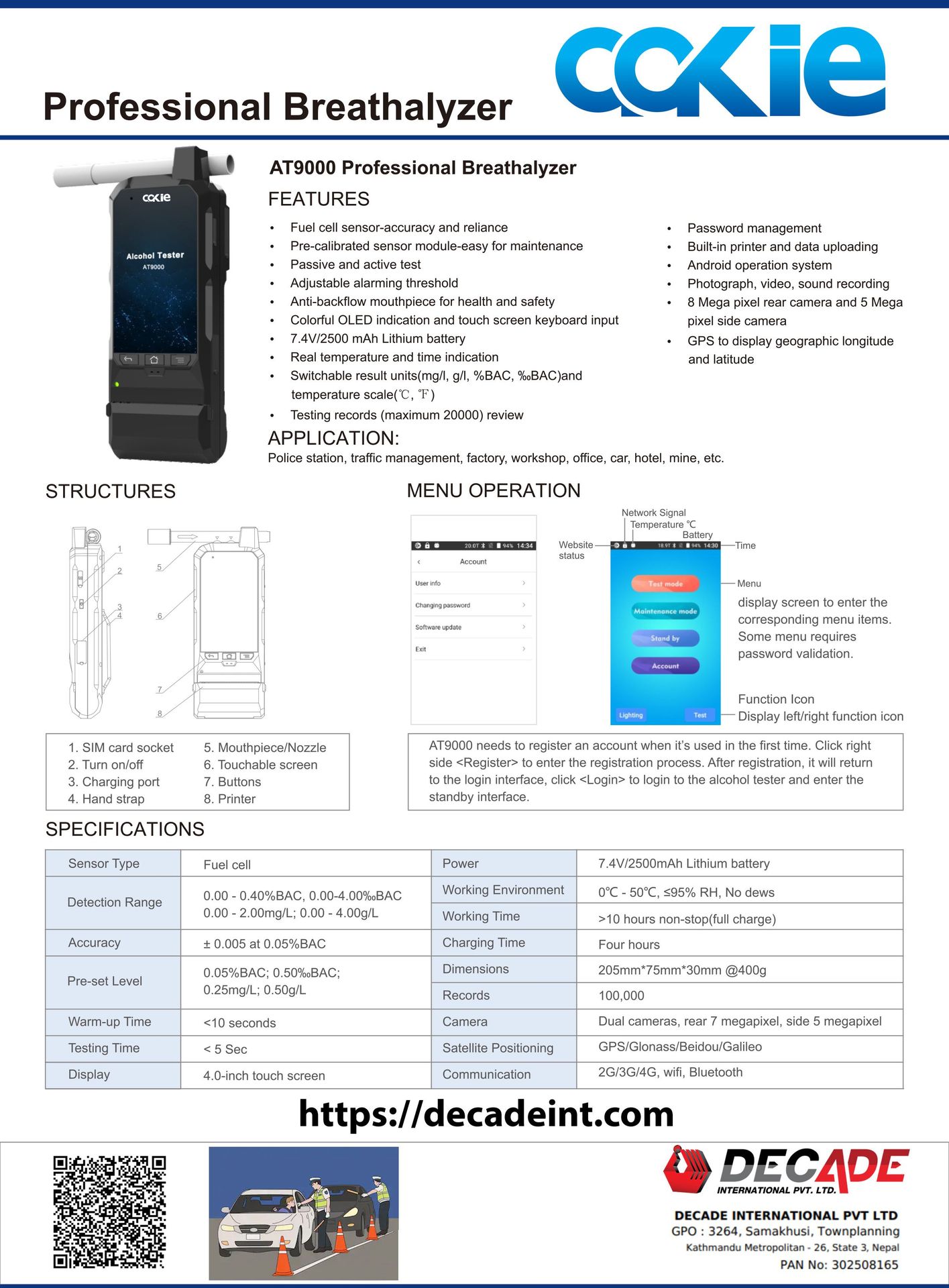 Pre-calibrated sensor module-easy for maintenance, Colorful OLED indication and touch screen keyboard input, Built-in printer, Camera and data uploading, Android operation system, Sensor type: Fuel cell, Working time: >10 hours non-stop(full charge), Passive and active test